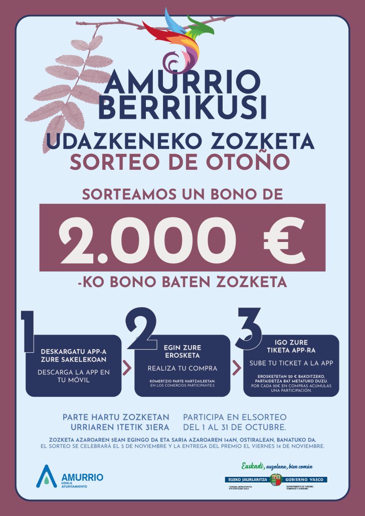 Por su parte, el Sorteo de Otoño repartirá un vale de compra de 2.000 euros que podrá canjearse en los establecimientos adheridos a Amurrio Berrikusi. Para participar, será necesario subir a la aplicación los tickets de compra realizados entre el 1 y el 31 de octubre. Cada 20 euros acumulados se transformarán en una participación en el sorteo, y completar la encuesta “Zuek erantzun, guk ikasi” otorgará una participación adicional.